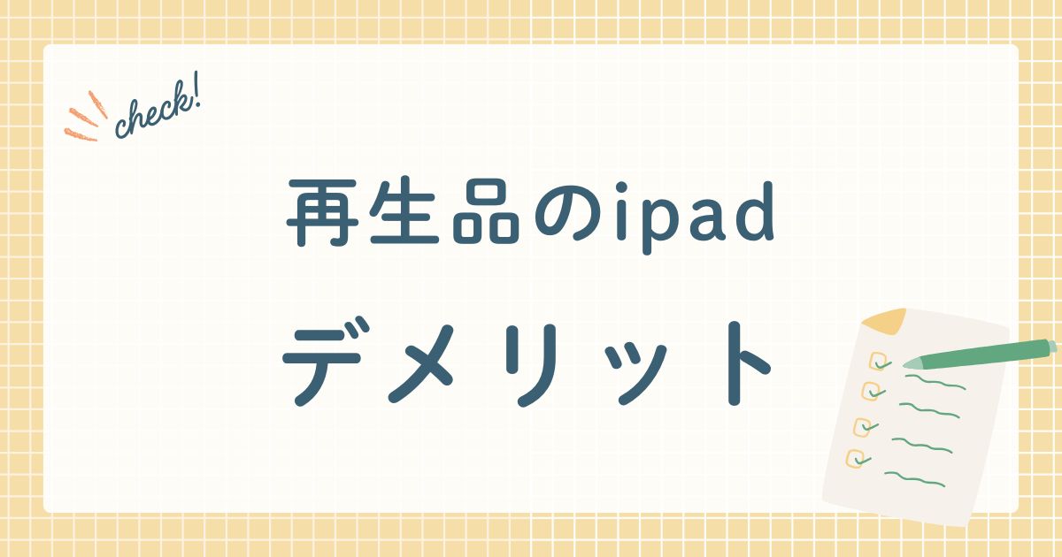 再生品のipadは、Appleが製造・販売している、タブレット端末です。 「再生品のipadの購入を検討しているけど、デメリットはないのかな?」と評判や口コミが気になっている方もいるのではないでしょうか。 再生品のipadを購入してみたいけど、デメリットは... デメリット