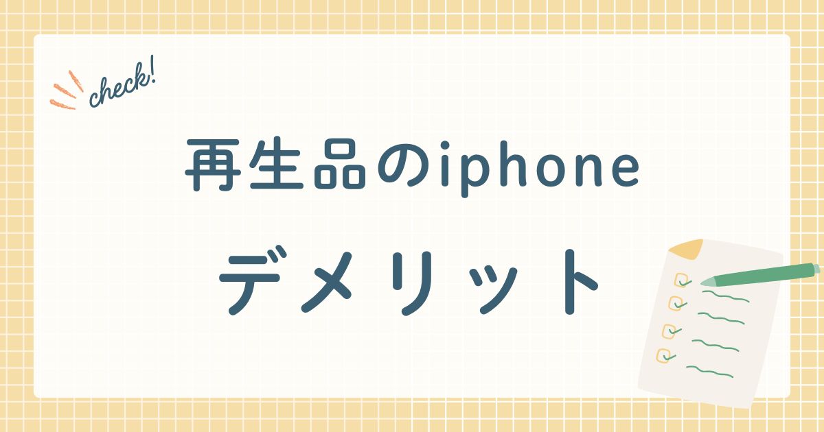 再生品のiphoneは、Appleが製造・販売している、スマートフォンです。 「再生品のiphoneの購入を検討しているけど、デメリットはないのかな?」と評判や口コミが気になっている方もいるのではないでしょうか。 再生品のiphoneを購入してみたいけど、デメリ... デメリット