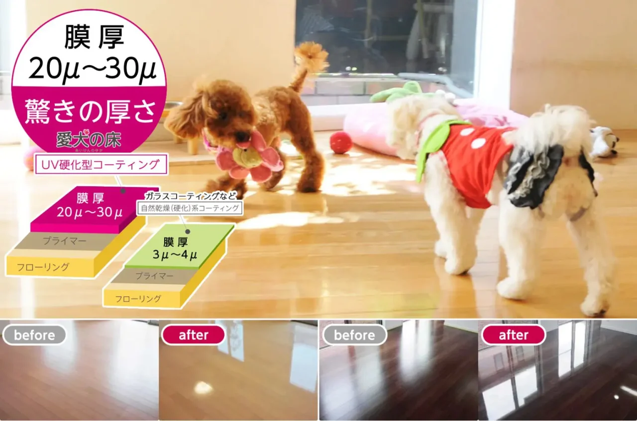 愛犬の床はフロアコーティング(UVコーティング)のなかでも、人気なフロアコーティング(UVコーティング)です。圧倒的な滑り止め効果、手入れの簡便さ、即日入居可能、長期保証、が評判で、多くの層から支持されています。