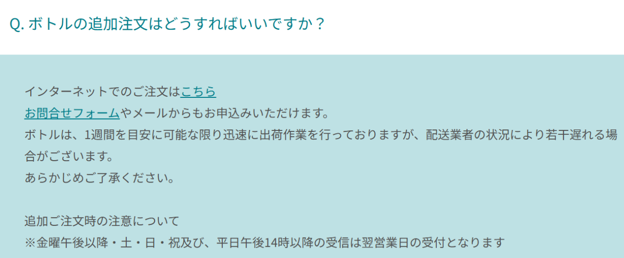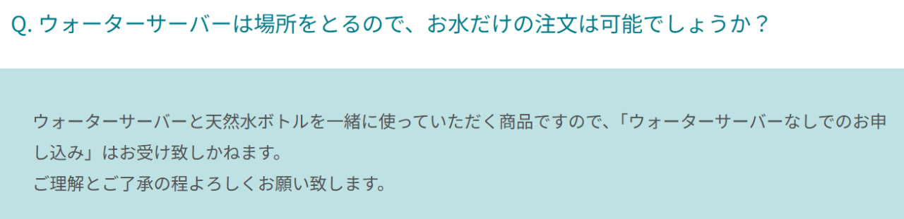 配達されたボトルをいくつかストックしておく必要があり、保管スペースが必要になります。ボトルがかさばるため、置き場所に困ると感じる人もいます。