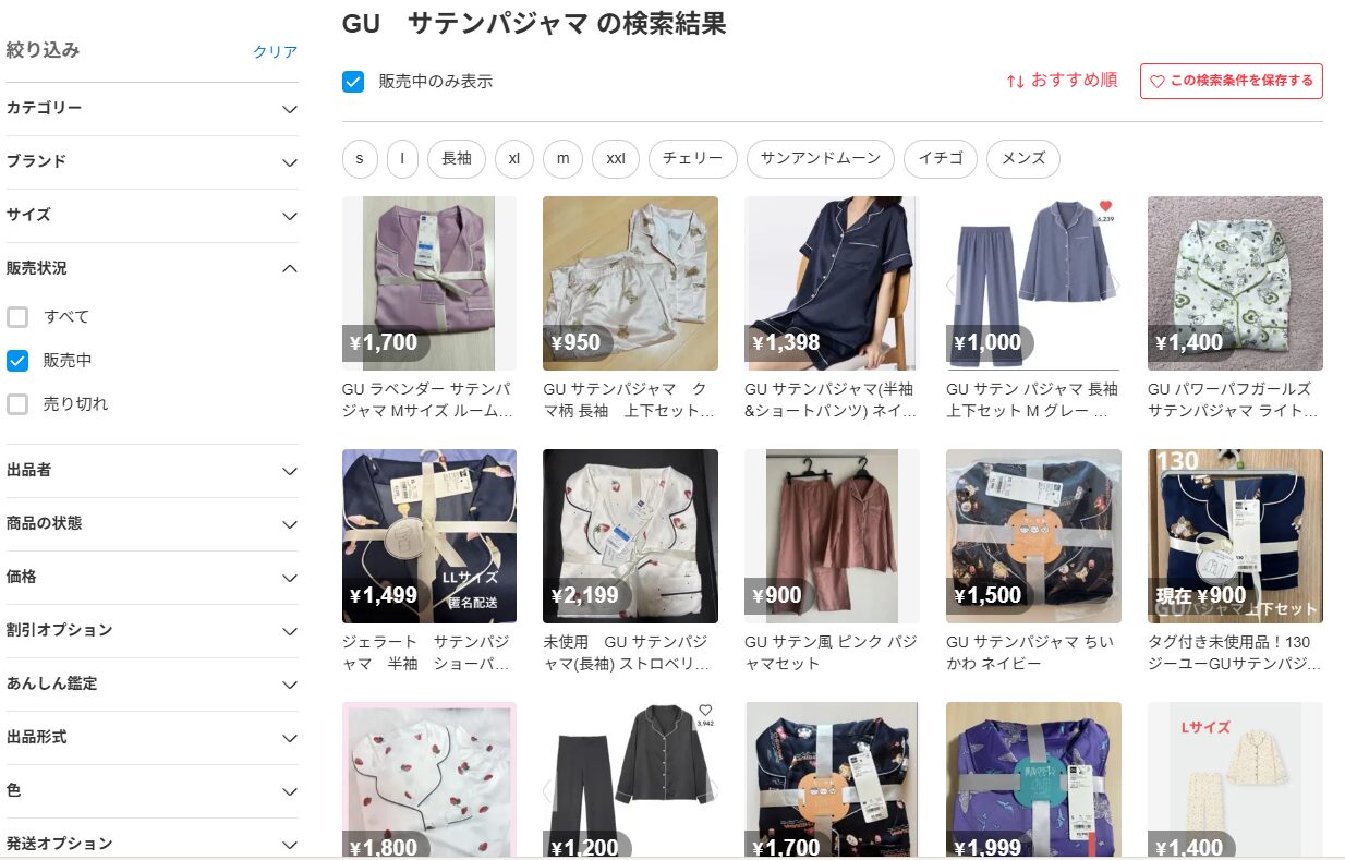 GU サテンパジャマはメルカリなどのフリマアプリでも購入できます。未使用のものや、気に入らなくなったものが出品されていたりするので、お得に購入できるかもしれません。