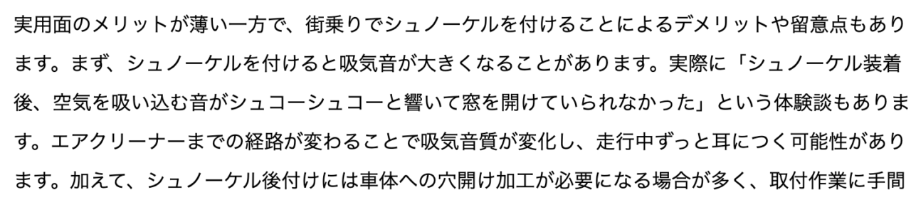 シュノーケル装着後、窓を開けた状態で「吸気音(風・エアの流れ音)」が気になる、という口こみもみられます。シュノーケルは外気を直接導入するパーツなので、空気抵抗や風切り音、共鳴音などの影響を受けやすいためです。