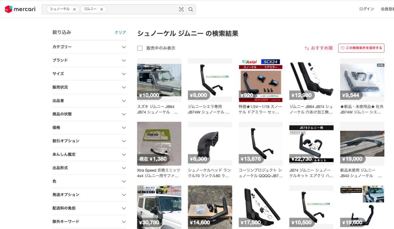 ジムニーのシュノーケルはメルカリなどのフリマアプリでも購入できます。未使用のものが出品されていたりするので、お得に購入できるかもしれません。