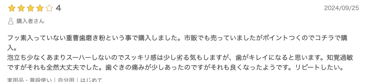 重曹(清掃剤)の働きにより、磨いた後の歯の表面が非常に滑らかになるという評価が多く見られました。一般的な歯磨き粉では得られない独特のツルツル感に満足するリピーターが多いです。