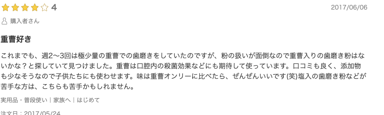 重曹つるつるハミガキの良い口コミ・評判をいくつか紹介します。