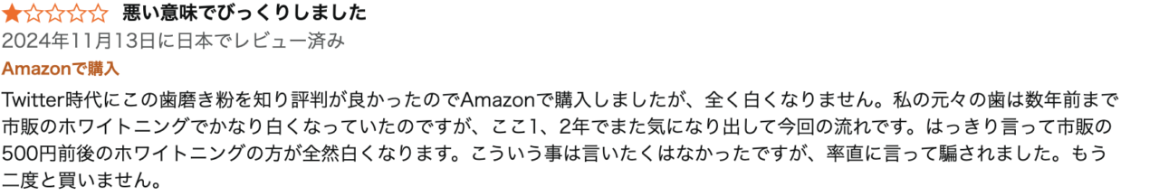 あくまで表面の着色汚れを落とすとされていますが、商品名や宣伝から歯そのものが漂白されるほどの「ホワイトニング効果」を期待し、結果的に「白くならなかった」「効果はよくわからない」と感じるようです。