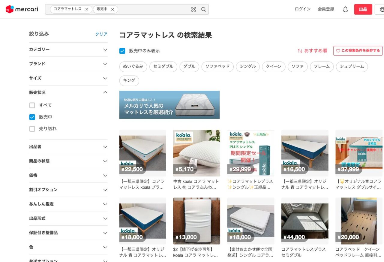 コアラマットレスはメルカリなどのフリマアプリでも購入できます。未使用のものが出品されていたりするので、お得に購入できるかもしれません。