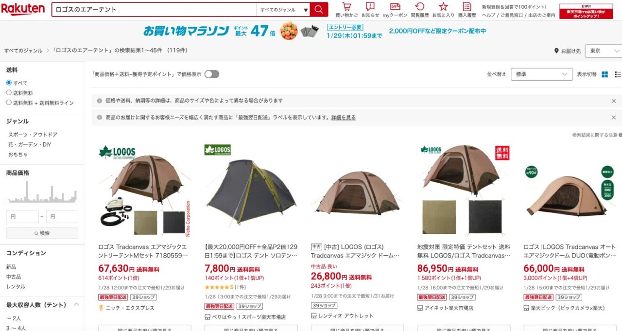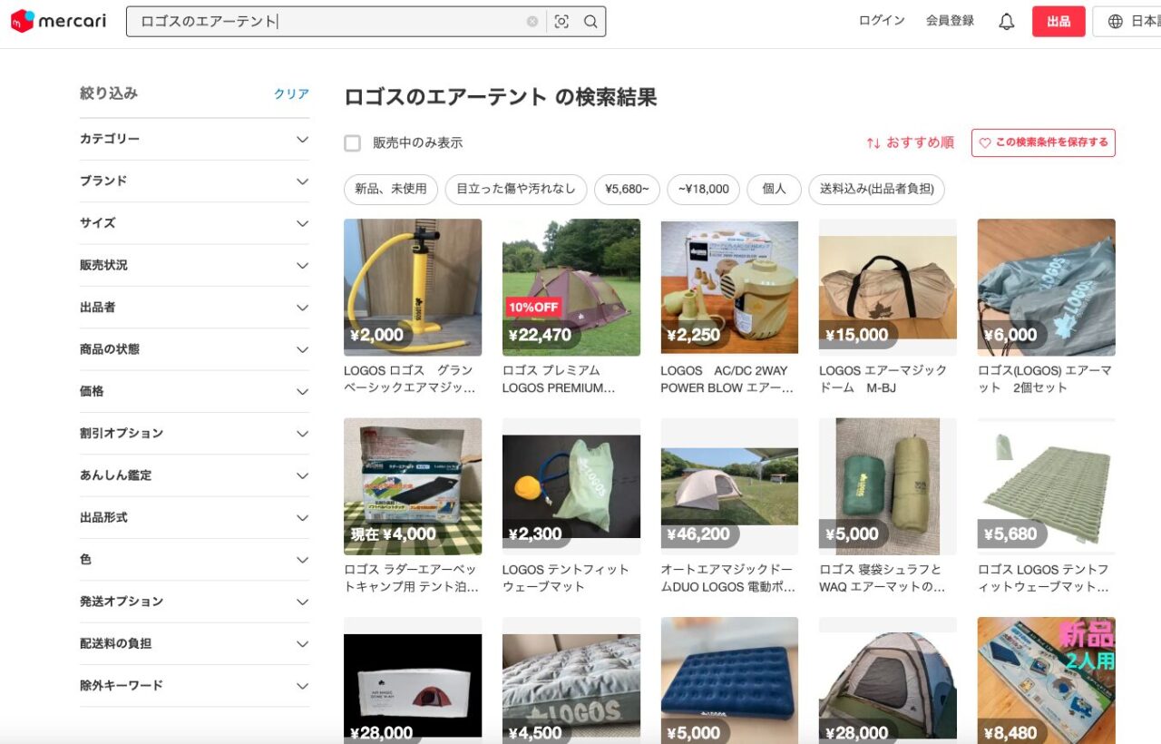 ロゴスのエアーテントはメルカリなどのフリマアプリでも購入できます。未使用のものが出品されていたりするので、お得に購入できるかもしれません。