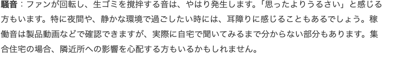 生ゴミの臭いがなく、音は気にならないし操作が簡単です。早く買えば良かったと思います。