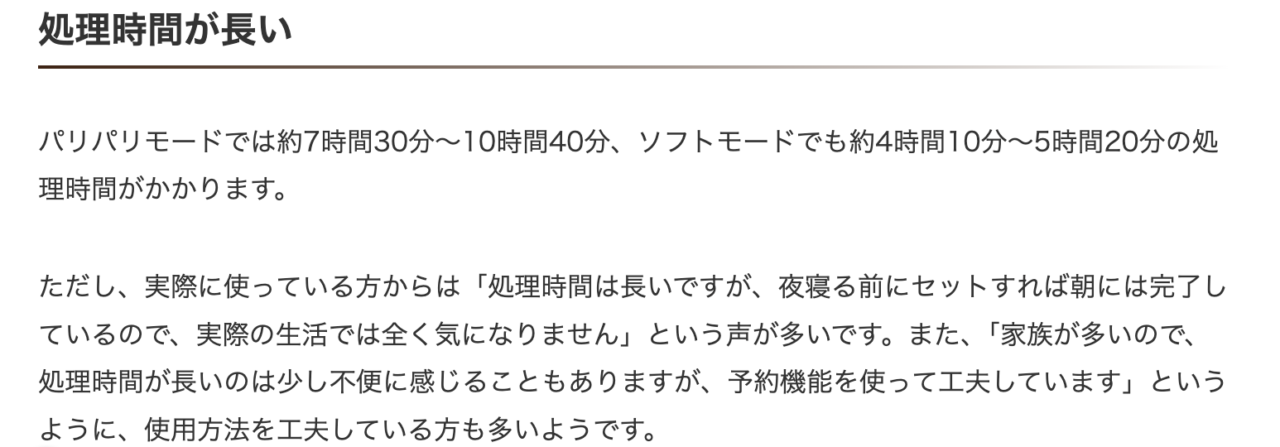 熱風で生ごみを乾かす仕組みなので、どうしても処理に時間がかかります。モードによっては7時間以上かかることもあり、少し不便に感じることがあります。
