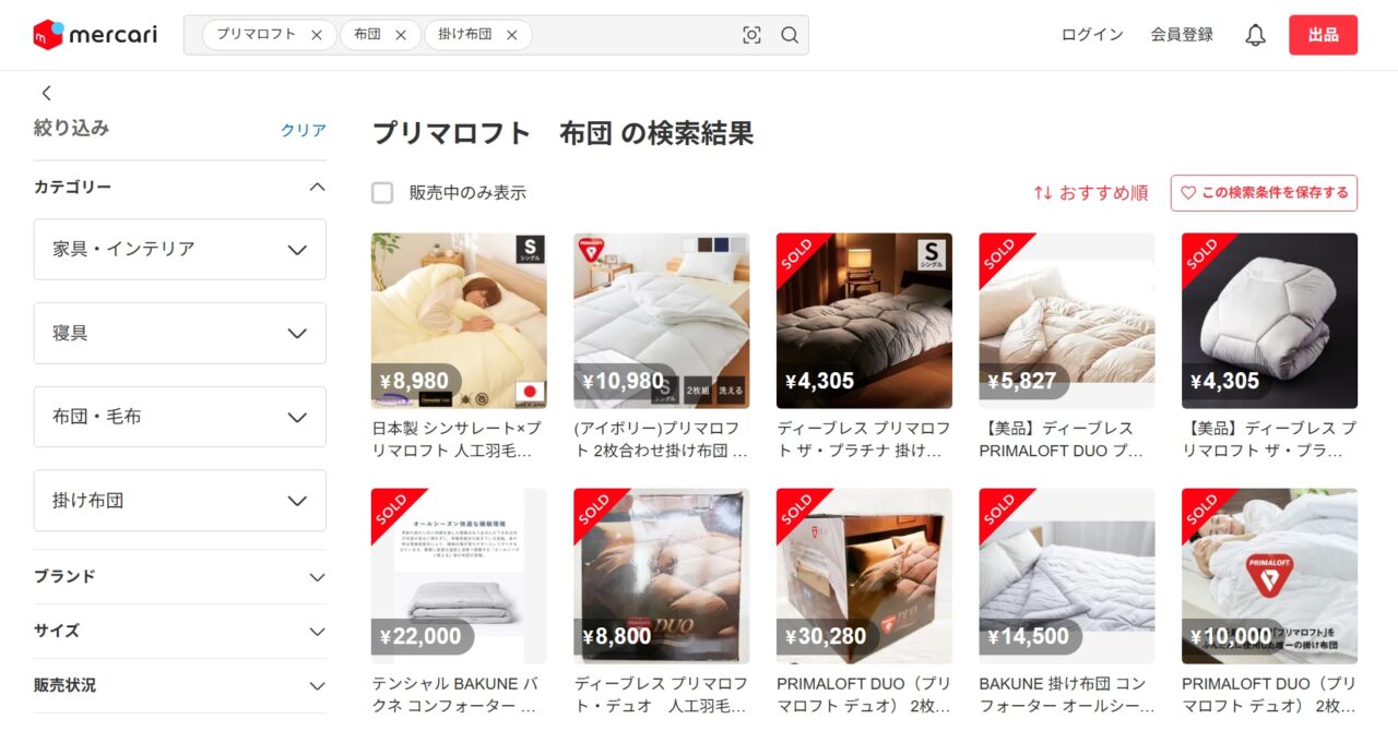 プリマロフトの布団はメルカリなどのフリマアプリでも購入できます。未使用のものが出品されていたりするので、お得に購入できるかもしれません。