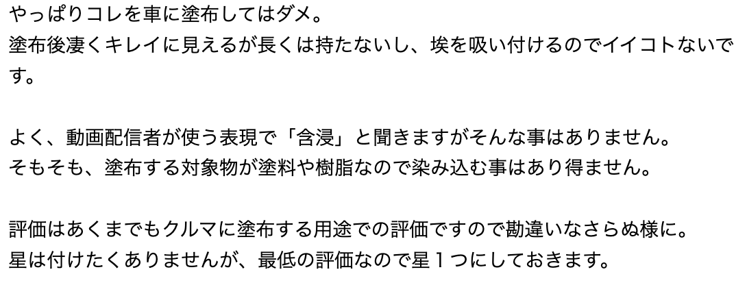 悪い口コミで圧倒的に多いのが「埃を吸着する」ということです。オイルであり硬化しないため、表面に粘着性が残りやすく、風の強い日や春先には車体が砂埃まみれになるという不満がみられます。保管場所が青空駐車のユーザーからは、特に厳しい評価を受けています。