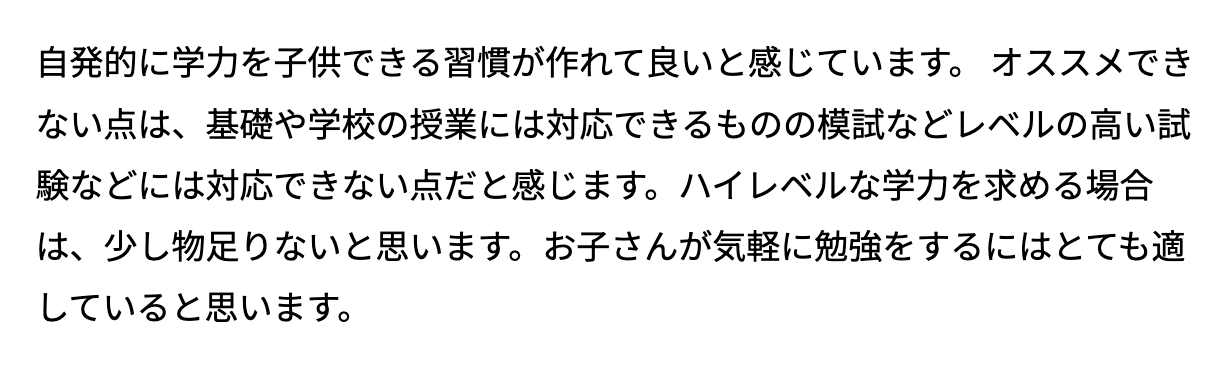 基礎~標準レベルの公立高校入試には強いですが、偏差値70を超えるような難関私立や独自入試問題には対応しきれないという声があります。トップ層にとっては演習問題の難易度が低く、物足りなさを感じて結局塾と併用することになるようです。
