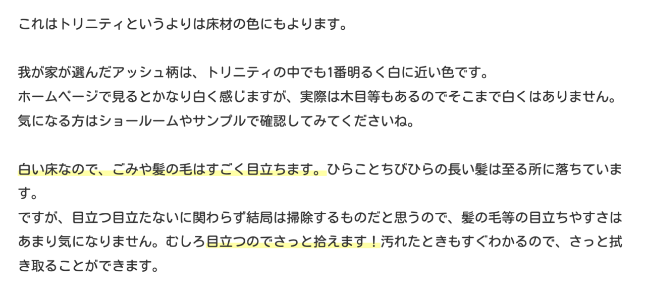 トリニティの床材に限定されませんが、白に近い色や柄を選んだ場合は、ゴミや髪の毛など汚れが目立ちやすいようです。