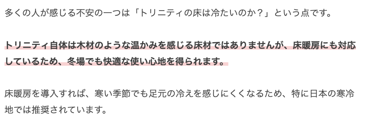 トリニティ 床のメリットの3つ目は、「床暖房にも対応で快適なこと」です。