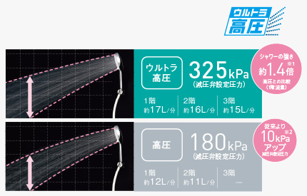ウルトラ高圧のメリットの1つ目は、「シャワーの勢いが強く快適」です。