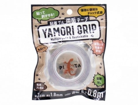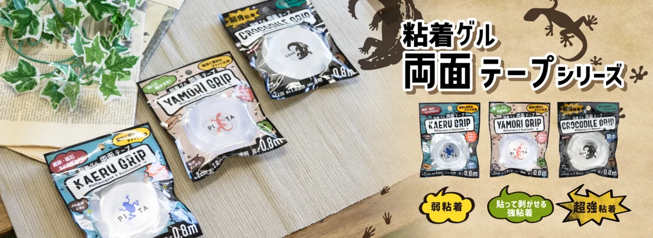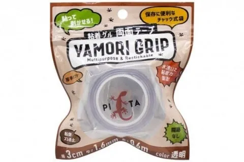 *「ヤモリテープjは、山田化学株式会社が展開している「粘着ゲル両面テープ」シリーズの3つの商品「カエルグリップ」「ヤモリグリップ」「クロコダイルグリップ」のうちの「ヤモリグリップ」を指し、「クロコダイルグリップ」は屋外や水回りにも対応できるアクリル製。「カエルグリップ」「ヤモリグリップ」はポリウレタン製です。